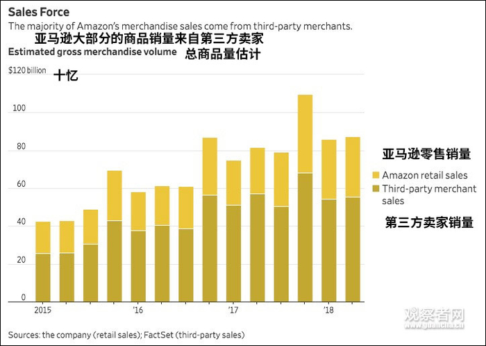 据FactSet的估计,目前有200多万商家在亚马逊上销售了5500万件商品,占该网站销售的一半以上,去年的商品总交易额估计达到2000亿美元。