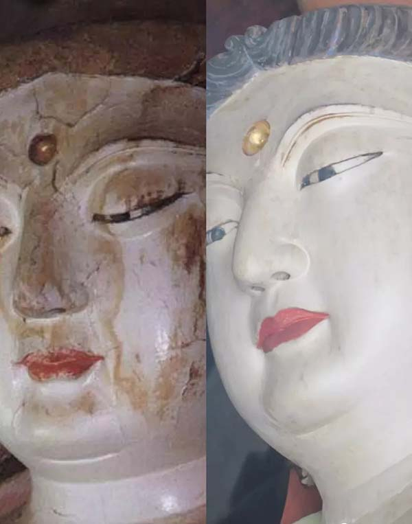 “胁侍菩萨造像的脸部通过检测分析为高岭土材料,白度达到普通A4纸的白度。我们仅对脸部的表面污染物、有害物进行了清除,未做脸部整体涂白处理。”
