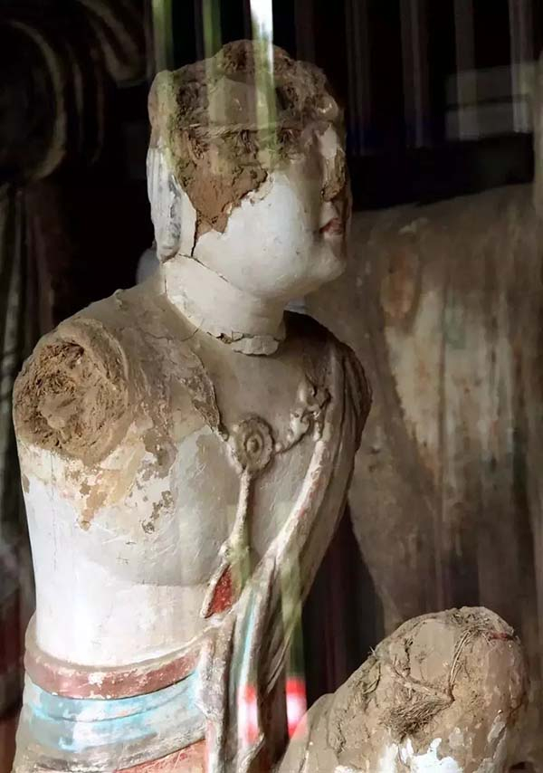修复前下寺大殿内佛坛上脸部破损的供养菩萨