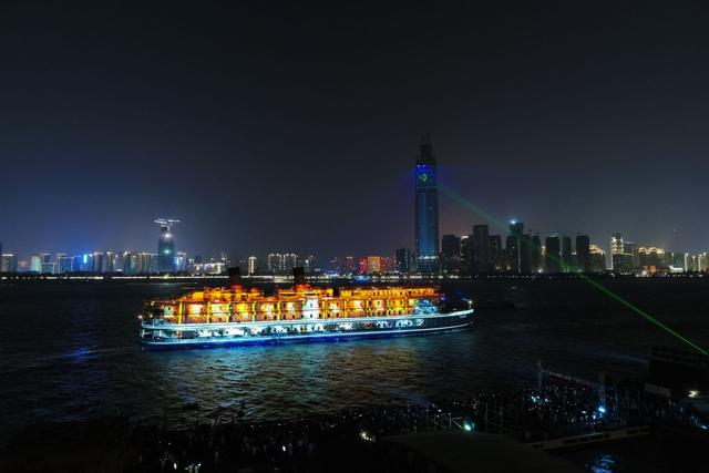 15日晚7时30分,汉口江滩“知音号”码头,激光直射天际,交相辉映,在夜空投射出不同的光影。江面凉风习习,大江对岸高低起伏的楼宇披上绚丽的灯光。全国“百城百社千团”的游客和江滩纳凉的市民其乐融融。