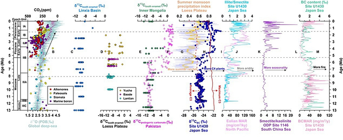 研究结果显示,在530万年左右广阔中亚区域C4植物发生显著扩张,C3植被相对减少,滞后南亚地区C4植被扩张约二百万年。在讨论构造时间尺度中亚植物演化历史时,研究人员首次将西风降雨变化作为中亚区域主要的降水来源之一纳入考虑,并且提出冬季西风水汽和夏季东亚夏季风降雨之间的竞争关系是决定亚洲生态系统中C3-C4植物转化的重要观点。由于全球变冷和青藏高原西北部(天山和帕米尔高原)的隆起导致冬季西风降水减弱,而东亚夏季风降水在上新世初开始增强,共同引起了中亚和黄土高原地区的干旱度和季节性差异增强,进而导致了中亚C4植被在晚中新世-上新世之交的扩张。与先前普遍认为的大气CO2浓度下降是驱动C4植物扩张的首要因素的观点不同,该研究认为CO2浓度下降更可能是C4植物扩张的前提条件而不是驱动因素,而构造驱动下的区域水文气候变化(尤其是季节性增强)才是影响C4植被扩张的最重要因素,这也是全球尺度C4植被扩张时间不完全同步的主要原因。该研究提升了人们对新生代以来气候和植被演化相互关系的理解与认识。