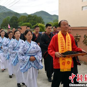 中新网南平9月17日电 (张丽君 魏永青)庄严肃穆的祭祀典礼、北苑皇纲隆重的开窑取器、趣味横生的的“茶趣·天伦乐”户外活动、“北苑印记·贡茶相约”追茶之旅……首届中华北苑茶神文化节17日在福建建瓯东峰镇落幕。