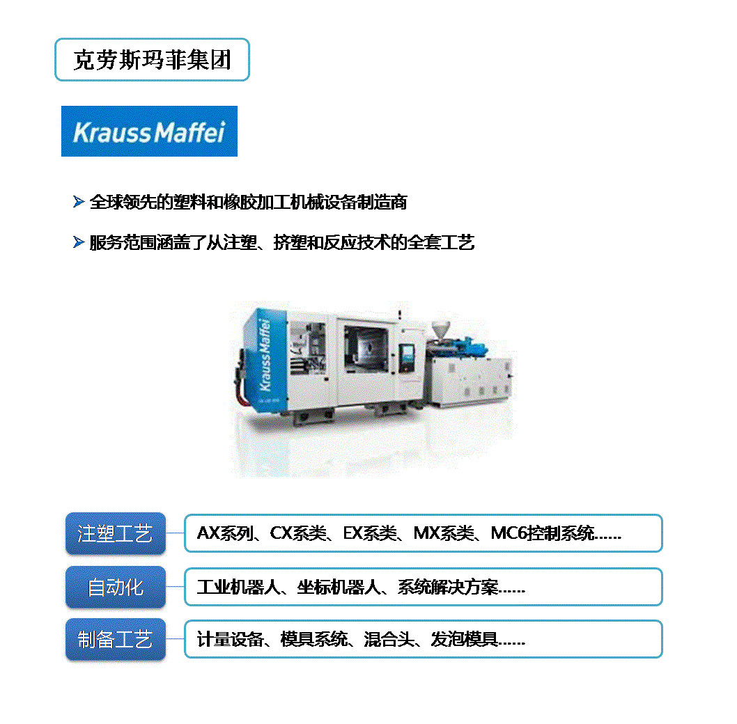 克劳斯玛菲是全球提供塑料、橡胶生产加工设备与系统的领先供应商之一,当前拥有约4000名员工,超过30家子公司。其中国公司分布于上海、浙江嘉兴及深圳三地。