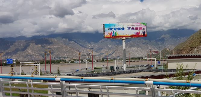拉萨外部通往拉萨市内的路。路边竖式广告牌上熟悉的标语从大巴窗户上一闪而过。“大众创业,万众创新”。这是李克强总理强调创业和创新时提出的口号。拉萨经济技术开发区副局长裴贻刚表示“开发区入驻有约5200家企业,三分之二都是与技术相关的风投企业”,“拉萨与中国其他地区相比毫不逊色,这里也涌现着创业热潮”。中国中央政府的政策正深入西藏,也改变着西藏的经济地图。