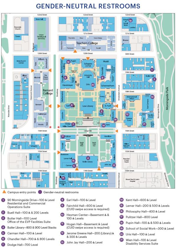 纽约哥伦比亚大学官网下载的“中性厕所地图”,标有该校园内21个社会性别中立的厕所的所在地。