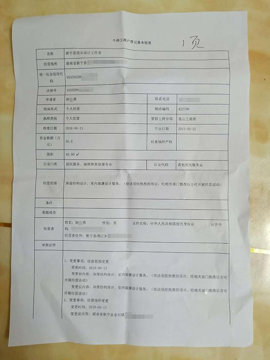 陈勇向澎湃新闻提供了一份《个体工商户登记基本信息》显示,新宁县顶尖设计工作室的经营场所位于新宁县金石镇,开业时间为2015年5月22日,其申请者、经营者均为“陈勇”,“陈勇”身份证号显示其1984年7月出生。