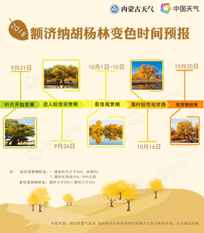 常年额济纳胡杨林的最佳观赏期为10月5日至17日。根据中国天气网、内蒙古气象局和阿拉善盟气象局联合推出的胡杨变色预报,受气温等因素影响,今年额济纳旗(以下简称“额旗”)胡杨林最佳观赏期可能比常年提早一些,恰逢国庆长假。预计,9月21日左右,胡杨林约20%-30%的叶片变黄。若没有强冷空气影响,大概每天有5%的叶片变色。10月1日起,胡杨林进入最佳观赏期,持续至10月15日。10月16日前后,秋风扫过,树叶开始飘落。10月20日左右,叶片落尽,胡杨一年一度的绚烂绽放就此落幕。