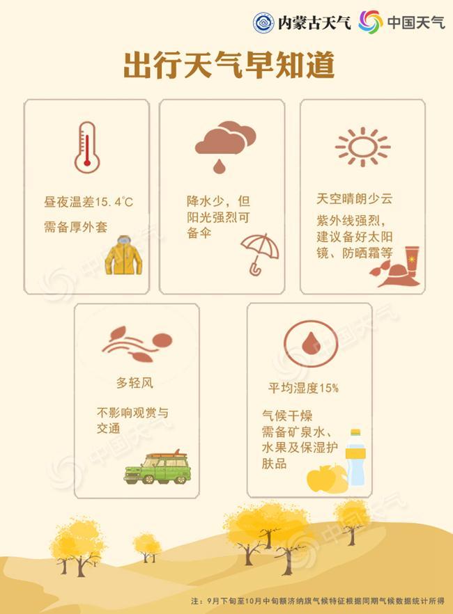 额旗地处沙漠地区,昼夜温差大。9月下旬至10月中旬,平均气温日较差达到15.4℃。国庆假期期间,额旗平均最高气温为21℃,平均最低气温为5℃。因此,游客出游前一定备一件厚外套,以抵御夜间的寒凉。同时,此期间额旗风不大,平均风力在2级左右,基本不会出现风沙漫天的情形,对出行出游影响很小。