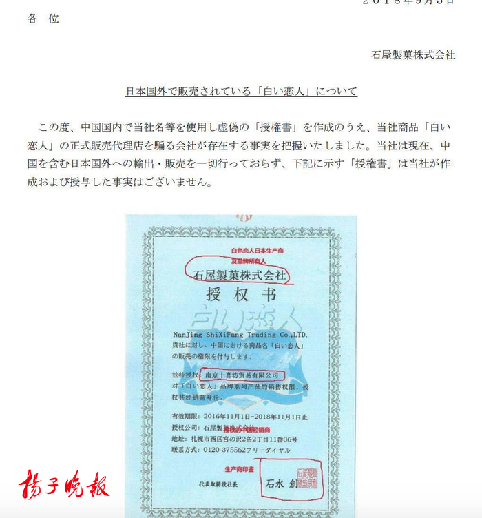 扬子晚报9月20日讯(实习记者 艾陆琦)日本北海道的零食“白色恋人”在中国广受年轻人好评,各大淘宝店铺和食品店均销售火爆,也有不少电商声称自己拿到“白色恋人”代理资格,并将“授权书”挂在店铺首页。然而就在近日,“白色恋人”的制造商石屋製菓在9月5日发布公告,并张贴南京十喜坊贸易有限公司的“授权书”,表明其证书系伪造,石屋製菓目前没有向日本以外的国家出口该商品。记者致电南京十喜坊贸易有限公司销售部工作人员后得知,此授权书并非公司制作。