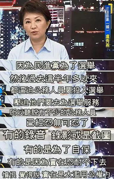 “公务人员忍无可忍了”,国民党“立委”卢秀燕道出个中玄机,原来是饱受民进党选举逼迫的公务人员,对执政党这种滥用公权力的做法实在看不下去了!