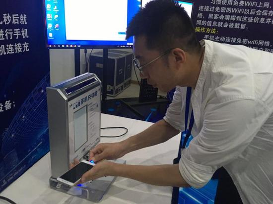 同样地,在另外一个展台前,记者看到另一种网络陷阱——主动式WiFi钓鱼。人们在公共场合习惯使用免费WiFi上网,但连接免密的WiFi以后会保存信息,以后手机会自动寻找手机内保存的WiFi网络,黑客会嗅探到这些信息并模拟相应的WiFi,让手机主动连上网,从而获取手机上的个人隐私信息。