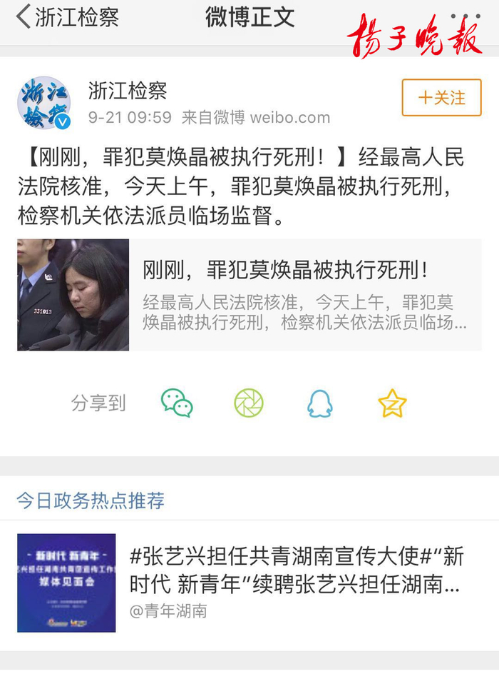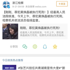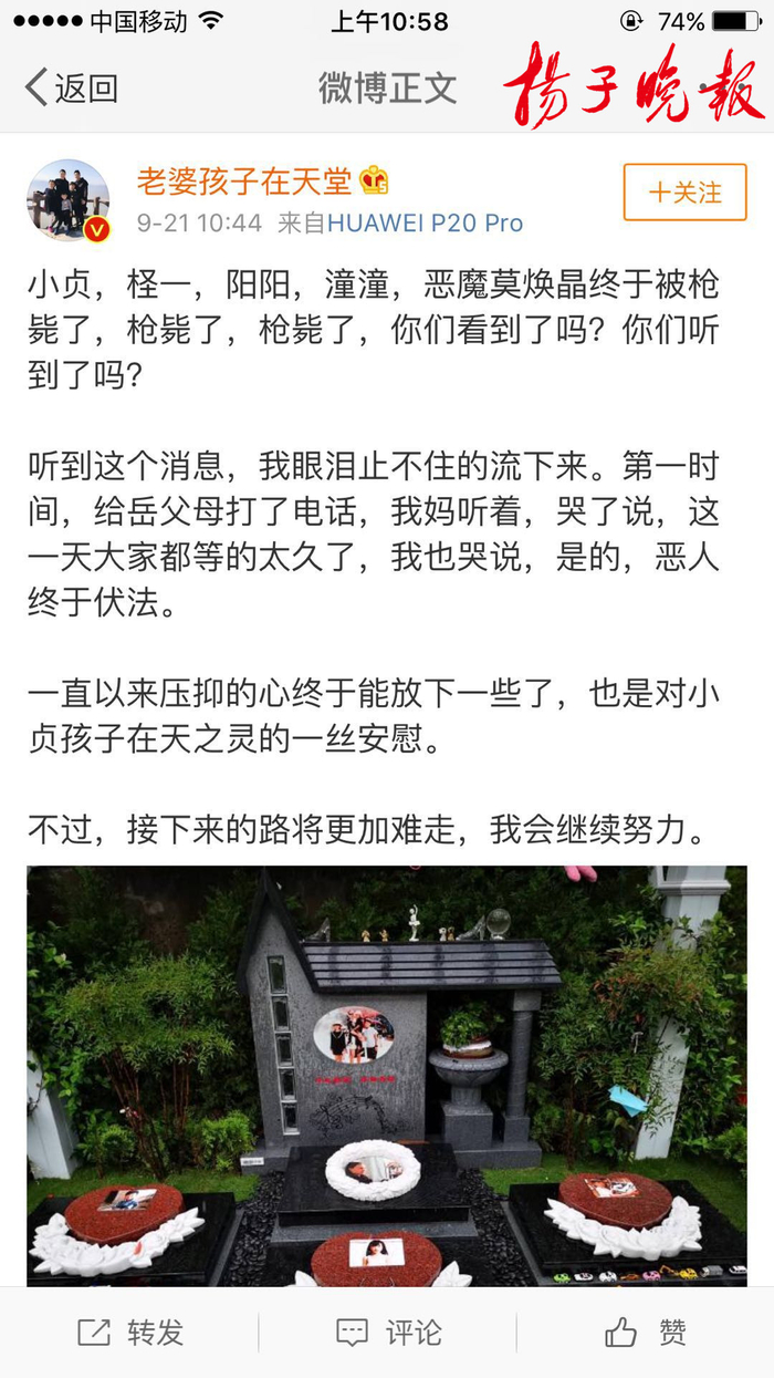 扬子晚报网9月21日讯(实习记者 艾陆琦)根据官方微博@浙江检察早上9点59分发布的消息,杭州保姆纵火案罪犯莫焕晶于今天上午被执行死刑。随后纵火案受害者家属林生斌微博发文悼念逝去的妻儿:“一直以来压抑的心终于能放下一些了,也是对小贞孩子在天之灵的一丝安慰。”