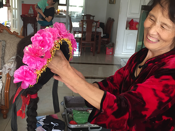 吴英民妻子向澎湃新闻展示李敬贤留下来的秧歌表演所用头饰