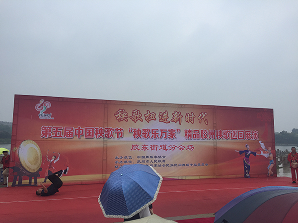 第五届中国秧歌节巡演走进胶州市胶东街道办,吴英民和他的剧团成员冒雨表演