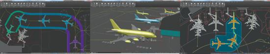 由于马尔代夫机场需满足F类飞机运行,对机场道面、机位等尺寸具有更严格的要求。为了更加准确高效地对机场空间尺寸进行规划设计,使用机场行业领先的AviplanAirsidepro软件进行控制,通过采用多机型—尤其是空间尺寸具有代表性的机型进行模拟运行,充分保证飞行区内场地尺寸的安全性、经济性。同时对飞机运行的尾流影响进行仿真模拟,减少尾流影响,提高运行效率。