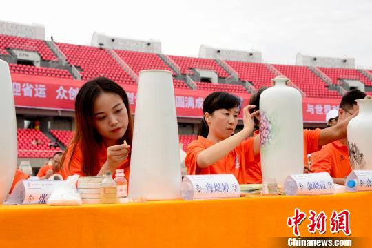 当天下午,“千名陶艺家迎省运众创吉尼斯荣誉大型创作活动”在江西省第十五届运动会主场馆景德镇市体育中心体育场内上演。绿茵场上,千余名陶艺家分散排开,正身端坐,笔蘸丹青,在白胎瓷瓶上挥毫创作,绘以青花、粉彩,花鸟、山水等题材,尽情展现千年瓷都艺术风采。