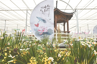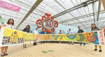 步入陌上花渡园区,就看到广场上庆祝丰收的标志性景观——可装30吨谷物的巨型粮仓。丰收畅想馆内,几百种蔬果和鲜花扮靓,装点着巨型南瓜、异形西瓜等新奇特农产品,一幅长9.23米、宽约1米的《欢庆丰收》格外吸引眼球,画作由9位南京六合的农民画家现场绘制,历时一个多月完成。江苏省面积最大的单体玻璃温室2.4万平方米,展示的真植物超过10万株。