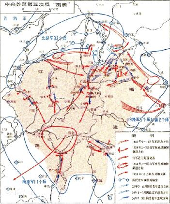 1933年9月25日,中国工农红军第一方面军在江西南部、福建西部反对国民党军第五次“围剿”的战役开始。从1933年9月25日至10月间,蒋介石调集约100万兵力,采取“堡垒主义”新战略,对中央革命根据地进行大规模“围剿”。这时,王明“左”倾机会主义在红军中占据了统治地位,拒不接受毛泽东的正确建议,用阵地战代替游击战和运动战,用所谓“正规”战争代替人民战争,使红军完全陷于被动地位。经过一年苦战,终未取得反“围剿”的胜利,最后于1934年10月仓促命令中央领导机关和红军主力退出根据地。