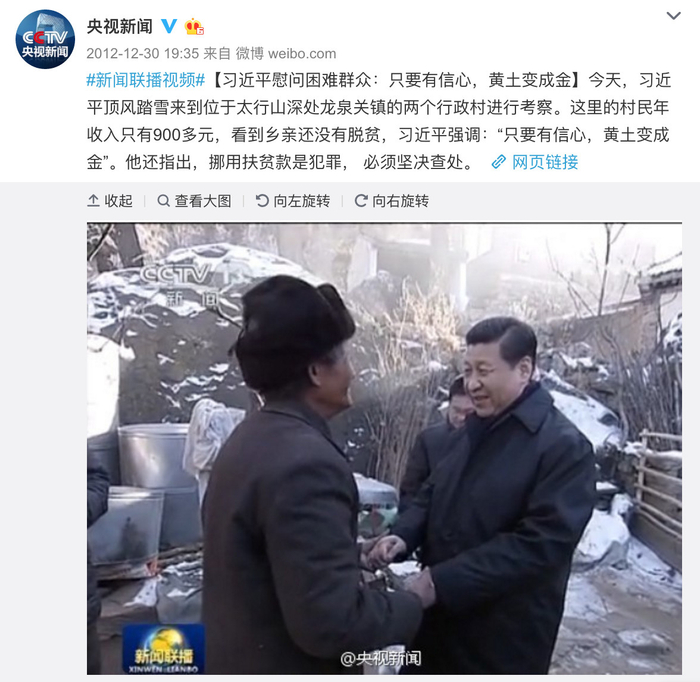 2012年底,习近平总书记在太行山区看望贫困村民。央视新闻微博首次以“微直播”方式同步播发系列报道。