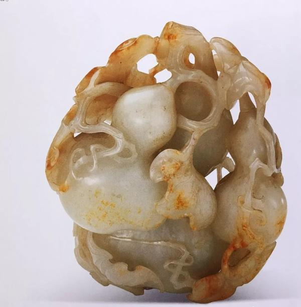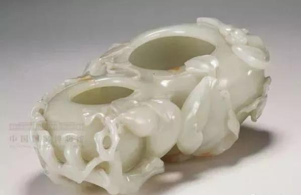 国家博物馆藏清宫旧藏葫芦形水盂,玉质细腻玉色润白,依葫芦形雕双椭圆器口,内部掏空,以做贮水、洗笔之用,外部透雕与高浮雕葫芦枝蔓、小葫芦及蝙蝠,枝蔓延伸至器底。