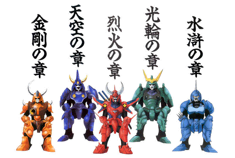 五位主角的译名也是惨不忍睹。五位少年正确译名应该是:仁战士烈火真田辽,义战士金刚秀丽黄,礼战士光轮伊达征士,智战士天空羽柴当麻,信战士水浒毛利伸。真田辽是真田忍军的后裔,动画中的铠甲都有家族徽章。不过奇怪的是,辽并没有使用真田家家徽,而是使用了真田家依附过的武田家割菱作为徽章。秀丽黄来自于清朝就移居日本的华侨家族,他的偶像是华人功夫巨星李小龙和成龙。伊达征士、羽柴当麻、毛利伸分别是伊达政宗、丰臣(羽柴)秀吉、毛利元就的后人,从他们的姓氏、出生地和家徽就可以看出来。他们的造型和属性也隐藏了不少的老梗,如伊达政宗是独眼龙,伊达征士也被设定为单眼受伤过的人,并一直用头发遮住一只眼睛;毛利水军战国时期日本第一,毛利伸的属性就被设定为水。