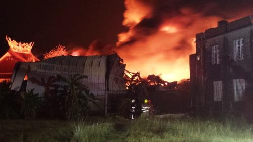 由于火势猛烈,消防队员难以强攻进入火场,消防局考虑到消防员安全,只好以固定水柱降温,控制火苗不烧到庙宇和民宅。