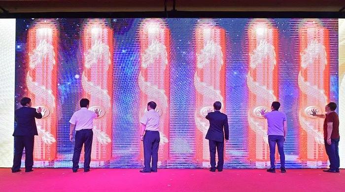 在激昂的乐曲声中,李光林、陈卫东、保明顺、王勇等领导,与客户经理代表和零售户代表,一起上台,共同揭开“玉溪”创牌45周年纪念版产品的神秘面纱,将整个发布会气氛推向高潮。
