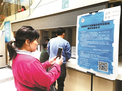在门诊大厅里,六十岁左右的患者叶奶奶正在认真阅读墙上贴着的《搬迁告病友书》,上面写着:“天坛医院将于2018年9月整体搬迁至新院区。如果在住院期间恰逢您所在的病区搬迁,请您不要着急。您的主管医师会对您的病情进行认真的评估,之后安排您下一步治疗的地点。如果需要转至新院继续治疗,我院会安排车辆,并确保转运途中患者的安全。”