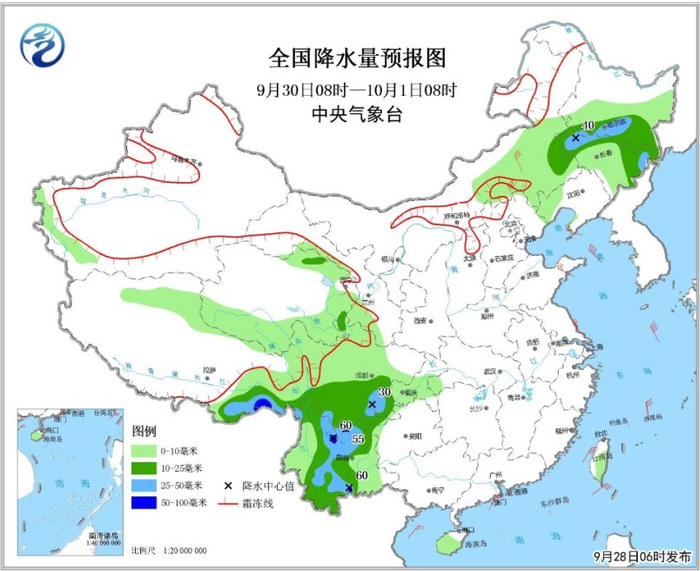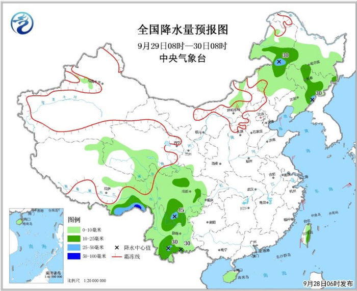 昨天,四川、云南、广西等地部分地区出现明显降雨,其中,云南红河、广西北海、广东茂名和云浮等地大暴雨(100~171毫米)。未来三天,四川南部、云南等地部分地区仍有大雨或暴雨。另外,受冷空气影响,西北地区东部、内蒙古、华北、东北地区将有大风降温天气;华北北部、内蒙古东部、东北地区将有小到中雨、局地大雨,辽宁等地伴有雷暴大风或冰雹等强对流天气。北京西部和北部地区28日午后有阵雨或雷阵雨,局地伴有短时大风。