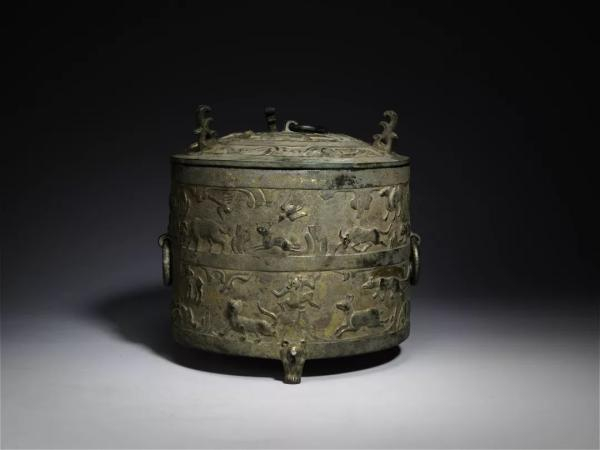 腹部饰上下两层浮雕动物纹,有虎、羊、骆驼、牛、猴和龙、凤等神异动物十余种。器口与盖下子口沿阴刻铭文:“中陵胡傅铜温酒樽,重廿四斤,河平三年(公元前26年)造”。器形端正大方,纹饰精美,动物形象逼真。该器即具有北方草原文化特色,又不失中原的典雅之风,是汉代青铜艺术和技术的典范之作。