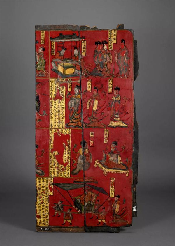 这件木版漆画,出土于司马金龙墓,是墓室屏风的一部分,采用渲染和铁线勾描的手法,板面涂朱漆地,用黑漆勾线条,色彩非常浓艳。