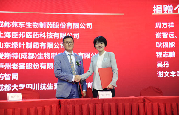 敬静代表学校分别与胡厂生校友、柯尊洪校友、四川科伦药业股份有限公司董事长刘革新以及四川奥邦药业有限公司董事长刘波、珠海丽珠药业集团副总裁唐阳刚签订了捐赠协议并向所有捐赠单位和个人代表颁发了捐赠书。据悉,“米玉士教育发展基金”将获得近2600万元的捐赠。