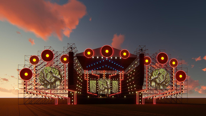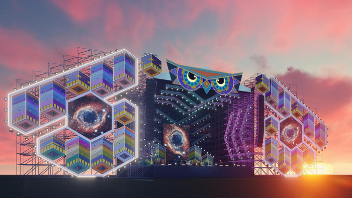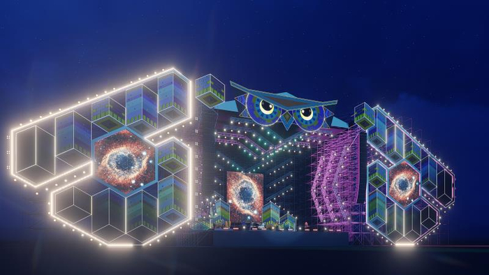 在去年的森林音乐狂欢节上,猫头鹰造型的“森林音符舞台”受到观众的一致好评,这一梦幻感十足的舞台设计搭配炫酷的灯光效果,让每一位观众大呼过瘾。今年,狂欢节即将登陆江宁方山新场地,舞台对面即是被“森林”覆盖的方山,“2.0版猫头鹰”将飞回狂欢节。据本届狂欢节舞台设计师姚毅介绍,今年森林音符舞台的顶棚将呈现猫头鹰的头部,延续了去年的图案纹理与色彩,大眼睛也保留了下来——“会动的眼睛是有灵魂的”。由于场地面积变大,舞台的整体宽度和高度都有所增加,这只巨大的“猫头鹰”终于有足够的空间展翅了——“羽毛”由一座座立体感十足的建筑构成,一支翅膀便是一片都市森林,狂欢节将把人们从都市带回自然,在绿色中放飞自我,充分显现出森林主题。