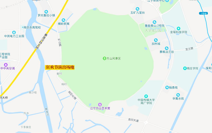 本届森林音乐狂欢节的举办地,位于江宁方山的西南侧——竹山南路与吉印大道交叉口,临近方山艺术营。该场地空间更大,功能更全,背靠植被繁茂的方山国家地质公园,自然风景优美,尽显“森系”风范,是目前国内不多见的专为户外音乐节打造的演出胜地,与“森林音乐”的调性完美契合。活动举办地交通便利,周边毗邻地铁一号线南延线和三号线,可全面优化广大观众的观演体验。