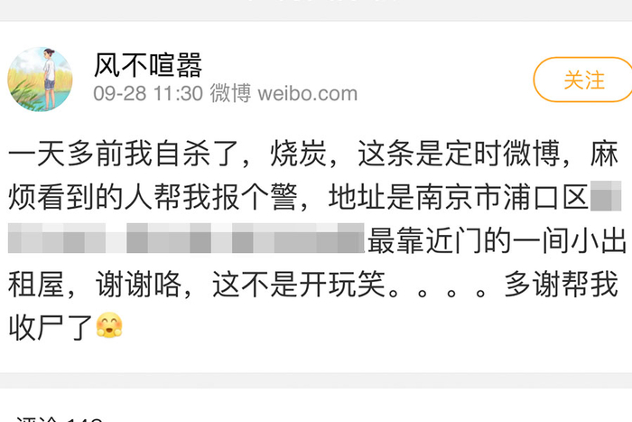 “一天多前我自杀了,烧炭,这条是定时微博,麻烦看到的人帮我报个警,地址是南京市浦口区旭日上城小区XX栋XX单元XXX室最靠近门的一间小出租屋,谢谢咯,这不是开玩笑……”