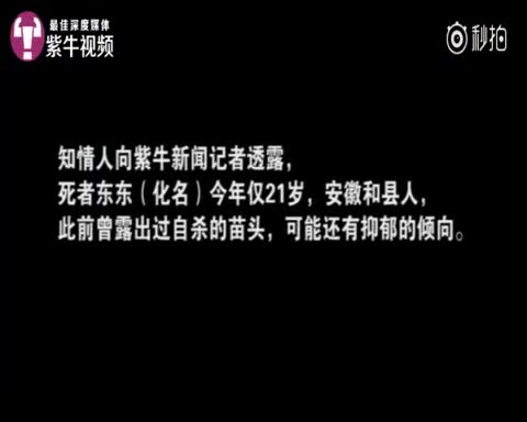 紫牛新闻记者了解到,目前当地警方经过调查,已排除他杀,小伙的死亡原因仍在进一步调查之中。知情人向扬子晚报紫牛新闻记者透露,死者东东(化名)今年仅21岁,安徽和县人,此前曾露出过自杀的苗头,可能还有抑郁的倾向。
