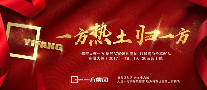 2018年1月29日,大连迎来2018年土地市场历史性第一拍。历经37轮竞拍,一方集团上演帽子戏法连下大连保税区三宗土地,大保(2017)-18号,大保(2017)-19号,大保(2017)-20号三宗地块尽收囊中。