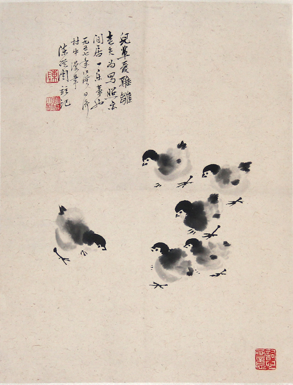 1957年陈从周在同济新村家中闲作雏鸡画一幅