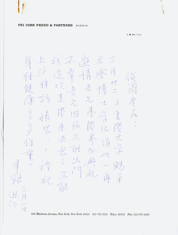 此外,陈从周与梁思成、贝聿铭等建筑学家也有诸多交往。展览中也展出了梁思成之妻林洙就辞海梁思成条目的讨论情况致陈从周的信,以及1980年代,贝聿铭与陈从周的往来信件。据考证, 1977和1978年,陈从周与贝聿铭在上海两度见面。1981年4月,陈从周邀请贝聿铭赴同济演讲,引起国内建筑学界的广泛关注。1985年10月,经陈从周之促就,贝聿铭先生接受同济大学聘请其为同济大学名誉教授,并于同济大学作学术报告。由于贝聿铭在建筑学界的地位,加之陈从周的影响,此行受到当时上海市领导的高度重视。1999年,贝聿铭还专程从美国来沪,到梓室探望已重病卧床多年的陈从周。