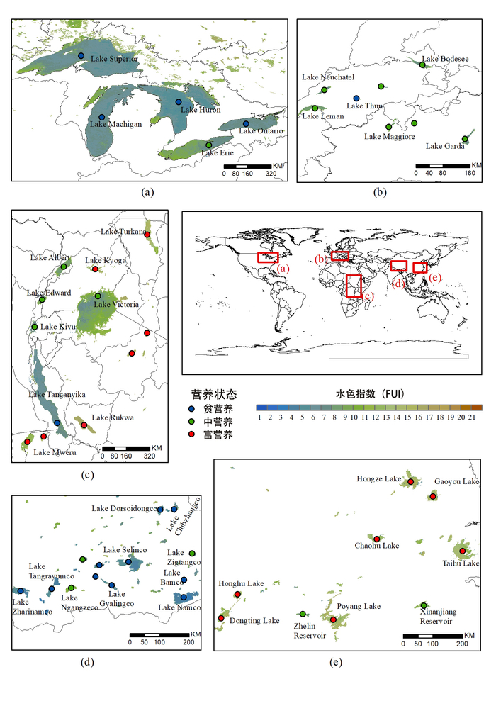 图2. 2012年夏季全球典型湖区大型水体水色指数(FUI)和营养状态图: (a)北美洲 Great Lakes 湖区;(b) 欧洲中南部湖区;(c) 非洲 Great Lakes 湖区;(d) 亚洲青藏高原湖区;(e) 亚洲东部长江中下游湖区