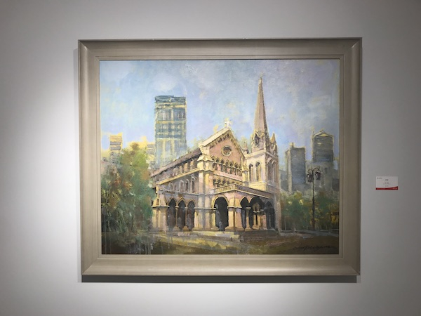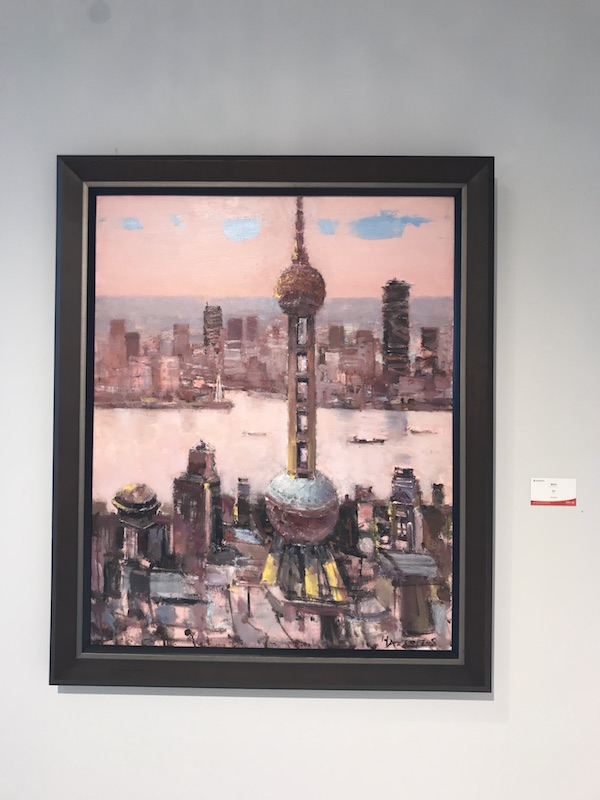 此次画展汇集了来自上海艺术界最具海派文化艺术特色的诸多名家作品近80件。其中不乏夏葆元、魏景山、姜建忠、王冠英等多位海派名家。“澎湃新闻”(www.thepaper.cn)记者在现场看到,展览上的油画作品涵盖了外滩沿线不同时代的地标建筑与场景,展现了外滩在不同时间的风貌,比如十六铺码头、外白渡桥、圣三一堂、半岛酒店等等,这些风格各异的油画串起了横跨百年的外滩记忆。外滩万国建筑群的发展变迁记载了上海开埠后生存、奋斗、进步的历史。融合、变革、创新,在外滩建筑百年来的发展中得到了充分体现。