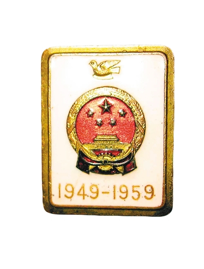 1959年国庆10周年,全国举行隆重庆典,制作了大量纪念章。这些纪念章中有的出现了“飞马”“龙腾”“和平鸽”等图案,内涵十分丰富,成为那个年代的真实写照。这枚国庆10周年纪念徽章,铜质,长方形,高23厘米,宽8厘米,上绘展翅奋飞的和平鸽,中绘庄重的国徽,下绘“1949—1959”数字,表明是建国十周年。该章图案简洁美观,极具纪念意义。
