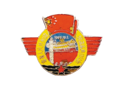 1949年,中央和地方有关部门制作的开国纪念章不下百余种。笔者收藏的这枚中华人民共和国开国盛典日纪念章为铜质,高3厘米,宽4厘米,正中是雄伟壮观的天安门和古朴精美的华表图案,上方飘扬着五星红旗,象征中华人民共和国诞生,下方刻有“1949.10.1”,外圆镌刻“中华人民共和国开国盛典日纪念”繁体字,外圆下方,一颗红色的五角星镶嵌在蓝色的大海中,外圆左右为红色对称的翅膀,寓意参加新中国开国盛典的海、陆、空三军接受人民的检阅。该章图案设计蕴意十分丰富,是具有代表性的经典纪念章。