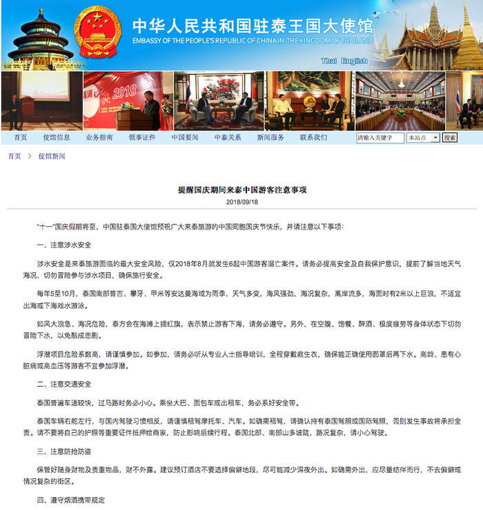 参考视频注意到,早在9月18日,中国驻泰国大使馆官方网站就发布了《提醒国庆期间来泰中国游客注意事项》。其中,就涉水安全、防盗防抢等方面注意事项做出了详细说明。