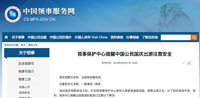 国庆假期来临之际,中国外交部领事保护中心于21日发布中国公民国庆出游注意安全提示,除常规的行前准备、入乡随俗、注意安全防范风险外,特别提醒国人在海外如果遇到问题或纠纷,需冷静应对,合情合理合法表达诉求,依法理性维权,莫让有理变无理。