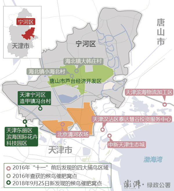 9月28日凌晨5:30左右,天津宁河区林业局收到群众举报,称造甲镇冯台村有非法收购催肥野生鸟类窝点,具体位置不详。接到举报后,宁河区林业局赶赴现场,在天津宁河区造甲镇冯台村村南一废旧养鸡场内,发现一个非法收购催肥窝点。经清查,共查获野生鸟类19889只(含死体151只),其中粟鹀723只、普通朱雀3579只、黄眉鹀15491只、黄胸鹀96只,案值590多万元,已构成刑事案件。宁河公安局对犯罪嫌疑人进行初步身份认定及目标锁定。