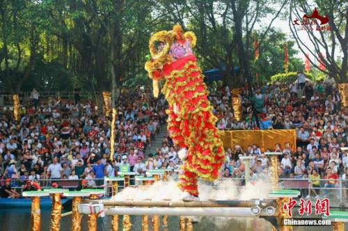 10月1日,广东佛山西樵山,为期两天的2018“黄飞鸿杯”第十四届世界华人狮王争霸赛暨水上双狮挑战赛吹响号角。中新社发 陈世江 摄