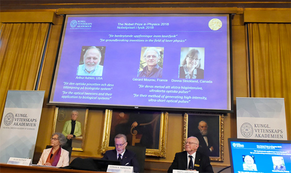 10月2日下午,2018年诺贝尔物理学奖揭晓。获奖者为美国科学家阿瑟·阿什金、法国科学家杰拉德·莫柔和加拿大科学家唐娜·斯特里克兰。获奖理由是3人在激光物理领域做出了开创性发明。