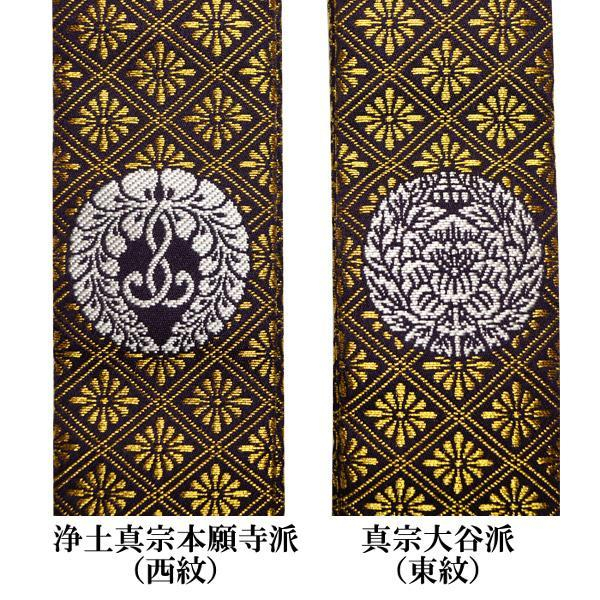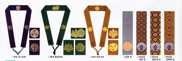 事实上,这种可与带Logo纹的名牌领带一比材质、做工与高价的环带,是日本民众进寺礼佛或参加法会的庄重正装,用来标识自己的佛教信仰与所属宗派,同时展现一定的佛门威仪。在江户时代,一些要求严格的寺院会在门口贴一张纸,上书“无念珠与袈裟者,不得入寺参拜”之类的话。要求普通檀家信徒穿着的袈裟就是各种大同小异的带状织锦,多称“半袈裟”,但净土真宗名之“门徒式章”或“略肩衣”。天台宗和真言宗有时还会在制作时缝入密教修行本尊的“种子(字)”,故又称为“种子袈裟”或“咒字袈裟”。刺绣着“南无大师遍照金刚、四国八十八所巡拜”字纹的种子袈裟是“四国遍路”等朝圣者的必备品。有些寺院常在大型庆典活动后回赠VIP信徒“纪念略袈裟”,往往是比念珠更具象征意义的重要信物。