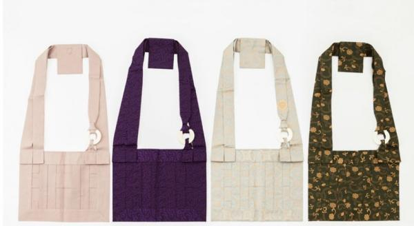 挂在脖子上、搭在西服外的一条条环带状绸缎,远看似乎只有颜色和长短的区别,实际上各大宗派都有自己的个性化设计,让人一眼可辨所属。简约者多在单色锦上刺绣精致的寺纹或宗纹,繁复华丽者可以把代表本派信仰的咒语、梵字、经文、寺名等图案铺满整条缎带。近年来一些法衣佛具店开始提供纹绣家徽的定制服务,虽然遭到不少佛教界保守人士的鄙夷,但并不妨碍时尚的檀家信徒以欢喜之心穿戴专属自家的袈裟,一如绣有家徽的和服,是家族历史与地位的象征,可以荣耀地传给子孙后代。也许还会出现绣饰卡通图案纹的袈裟,就像不少寺院已经出售了多年的带有“Hello Kitty”和“哆啦A梦”形象的护身符(御守),深博孩子们的喜爱。